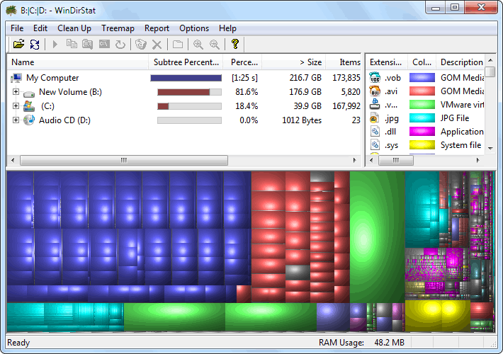 The treemap represents each file as a colored rectangle, the area of which is proportional to the file’s size. The rectangles are arranged in such a way, that directories again make up rectangles, which contain all their files and subdirectories. So their area is proportional to the size of the subtrees. The color of a rectangle indicates the type of the file, as shown in the extension list. The cushion shading additionally brings out the directory structure.